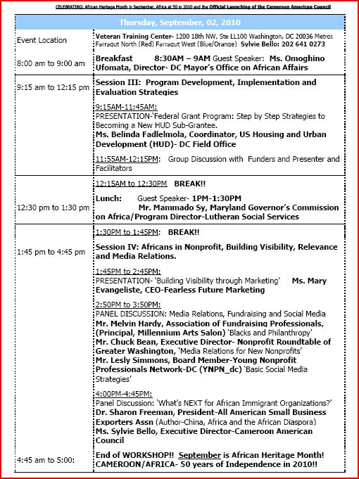 You can reach Sylvie @ 202-641 0273 or via email sylviebello.dc@gmail.com or Cameroon.american.council@gmail.com