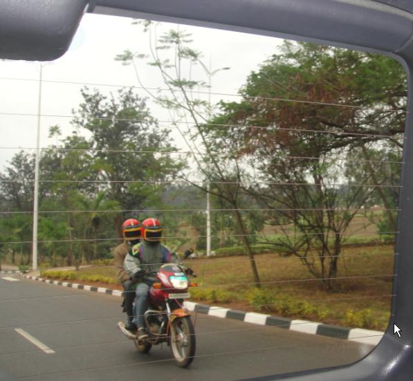 Bike (aka bend skin, okada) drivers wear a coat with an ID number clearly marked. The bike driver and passenger wear helmets!!!