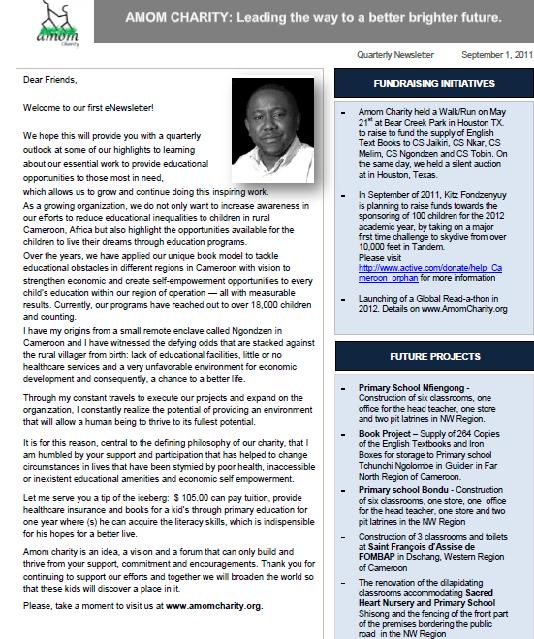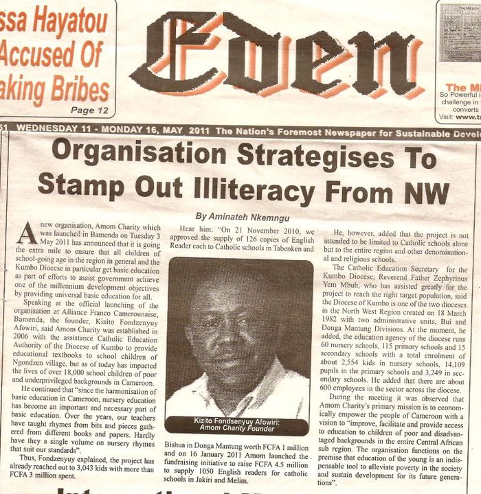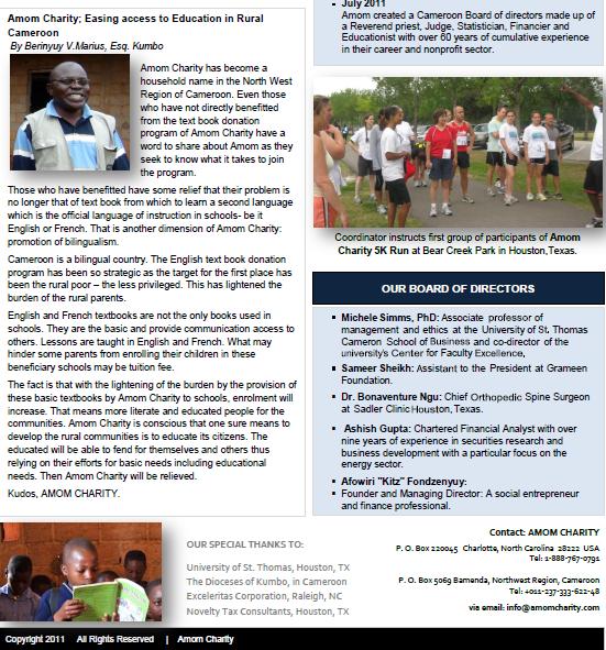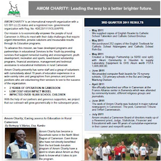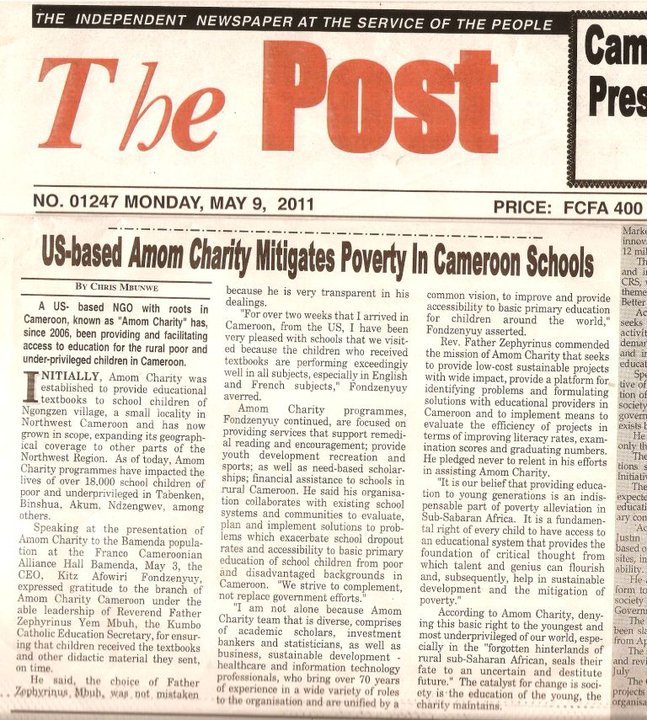 AMOM CHARITY is a registered international nonprofit organization. Amom’s primary mission is to economically empower the people of rural Cameroon to meet with their daily challenges that require urgent intervention, provide solutions and measurable results through its Education programs. To advance this mission, programs and partnerships have been developed in educational Services to the Youth by providing services that support the following