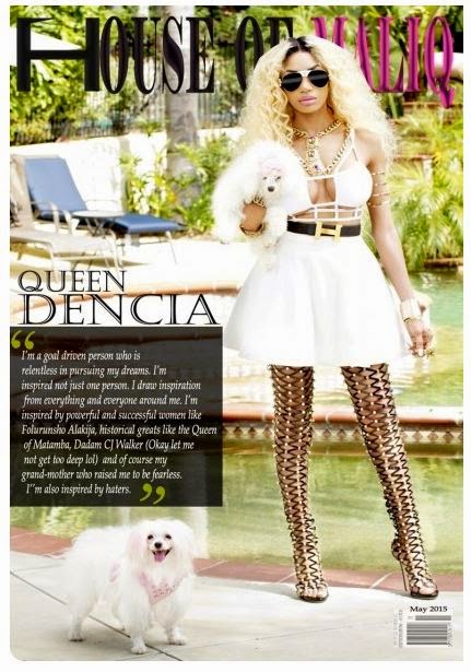 Teaming up with photographer  once again, Scott Herbert  brings her sexy looks to the 2nd may 2015 cover edition of our delightful magazine. The pop singer poses in bold and colorful looks including a white dress, Multi-colored jumpsuit and gold jumpsuit (overall)  with some standout designs from her clothing line.. Dencia is not only known as a singer and a controversial  fashionista, she is also well known as a business mogul.
